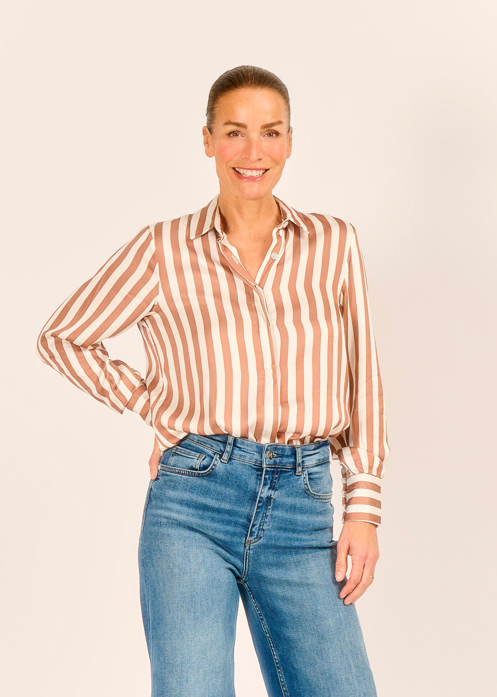 Feinste, fließende Viskose bildet die Basis für diese edle Streifenbluse und sorgt für einen eleganten Fall sowie ein luxuriöses Tragegefühl auf der Haut. Das Design überzeugt durch stilvolle Details wie die breiten Streifen, die saubere verdeckte Knopfleiste, den kleinen Kragen und die besonders hohen Manschetten an den Ärmeln. Mit diesem zeitlosen Key-Piece gelingt Ihnen mühelos ein professioneller und gleichzeitig modischer Look, der in keinem Kleiderschrank fehlen sollte.