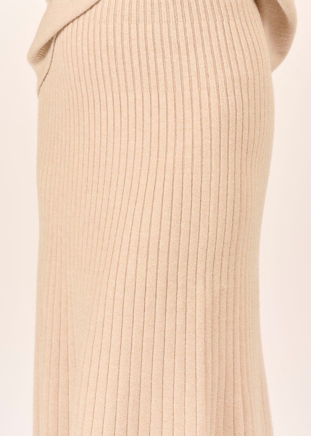 Der Rippenstrickrock in hellem Sandton strahlt schlichte Eleganz und natürliche Wärme aus. Seine feine Struktur betont sanft die Silhouette und sorgt für ein angenehmes Tragegefühl – perfekt für jeden Tag. Ein vielseitiges Basic, das sich mühelos von lässig bis elegant kombinieren lässt.