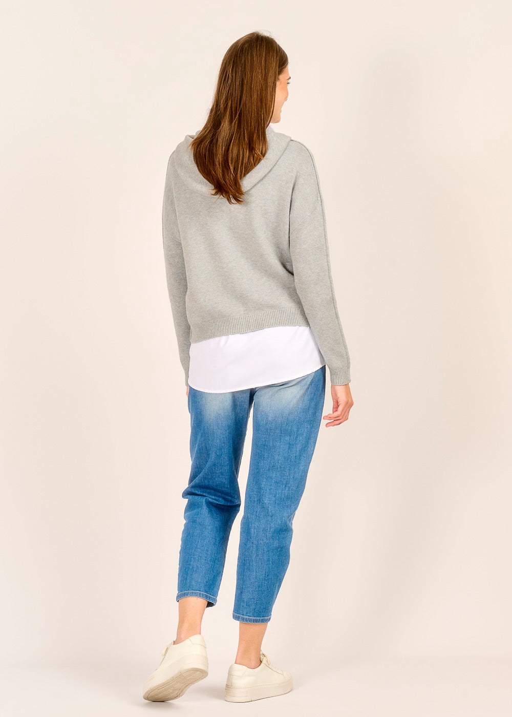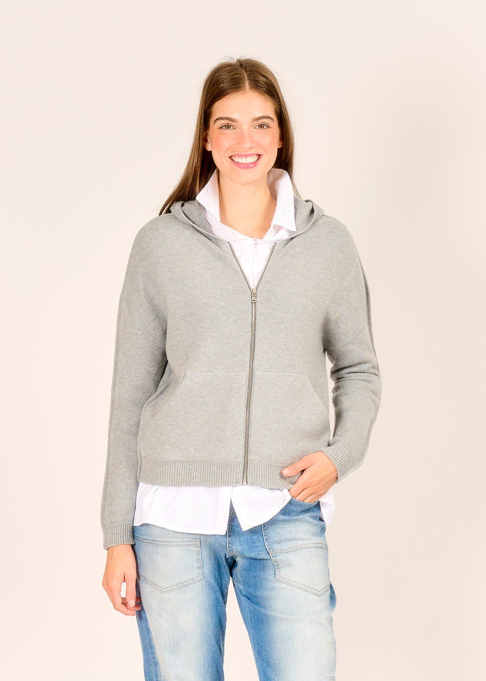 Genieße luxuriösen Komfort mit unserer edlen Strickjacke in sanftem Grigio. Die hochwertige Verarbeitung und das kuschelige Material machen sie zu deinem neuen Lieblingsteil. Ein besonderes Detail ist die seitliche Naht an den Ärmeln, die dem lässigen Hoodie-Schnitt eine moderne Note verleiht. Egal, ob über einem Hemd oder T-Shirt, diese Strickjacke ist perfekt für einen stilvollen und entspannten Look.