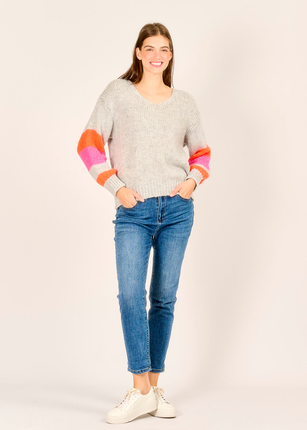 Füge deiner Garderobe einen Farbtupfer hinzu mit unserem Pullover in meliertem Grau. Das weiche Material sorgt für ein kuscheliges Tragegefühl und macht ihn zum perfekten Begleiter für kühle Tage. Ein echter Hingucker sind die bunten Ringel in Pink, Orange und Weiß an den Ärmeln. Mit seinem lässigen V-Ausschnitt passt er perfekt zu Jeans und verleiht deinem Outfit einen coolen und entspannten Look.