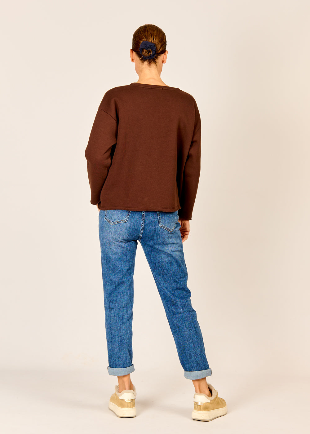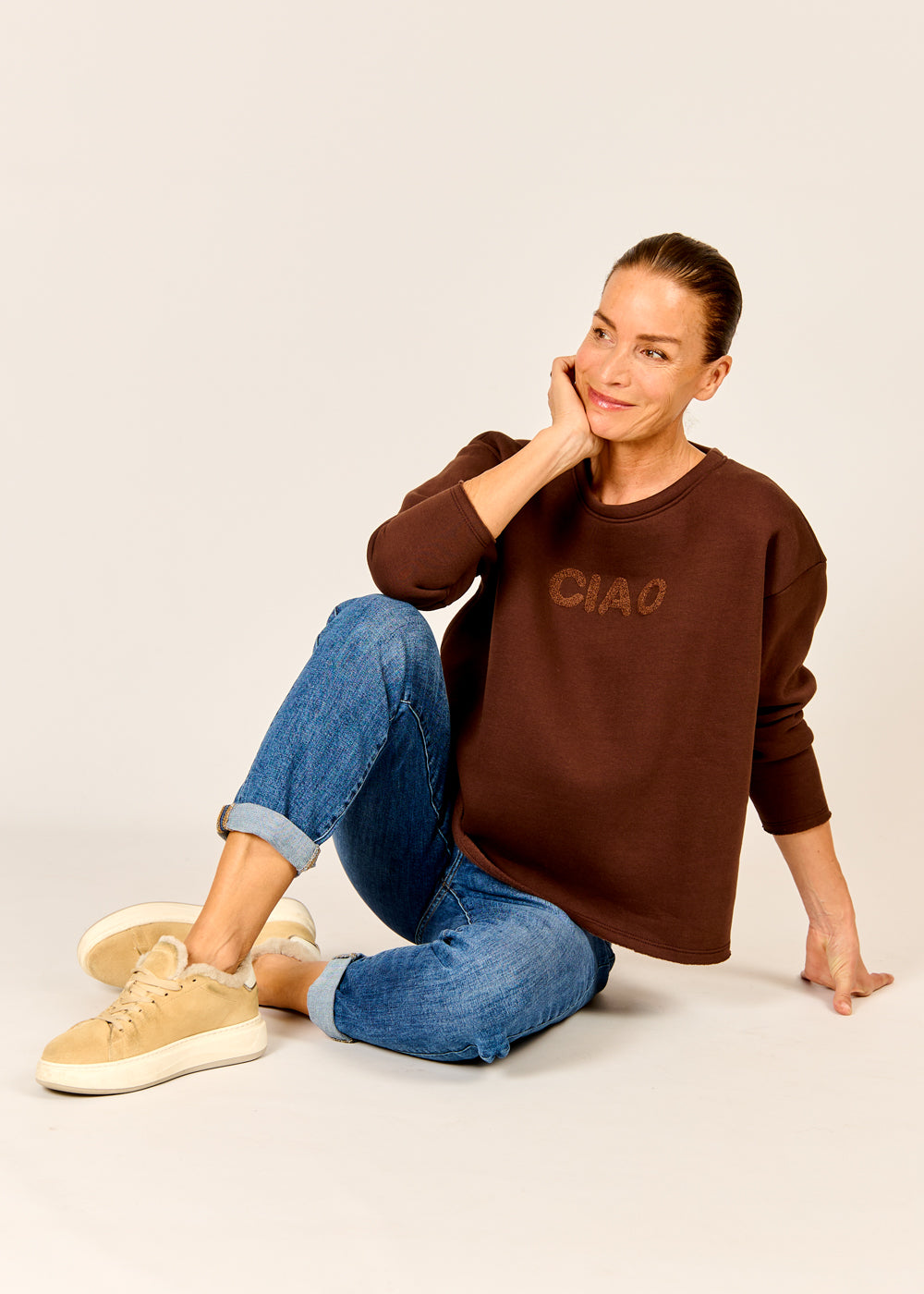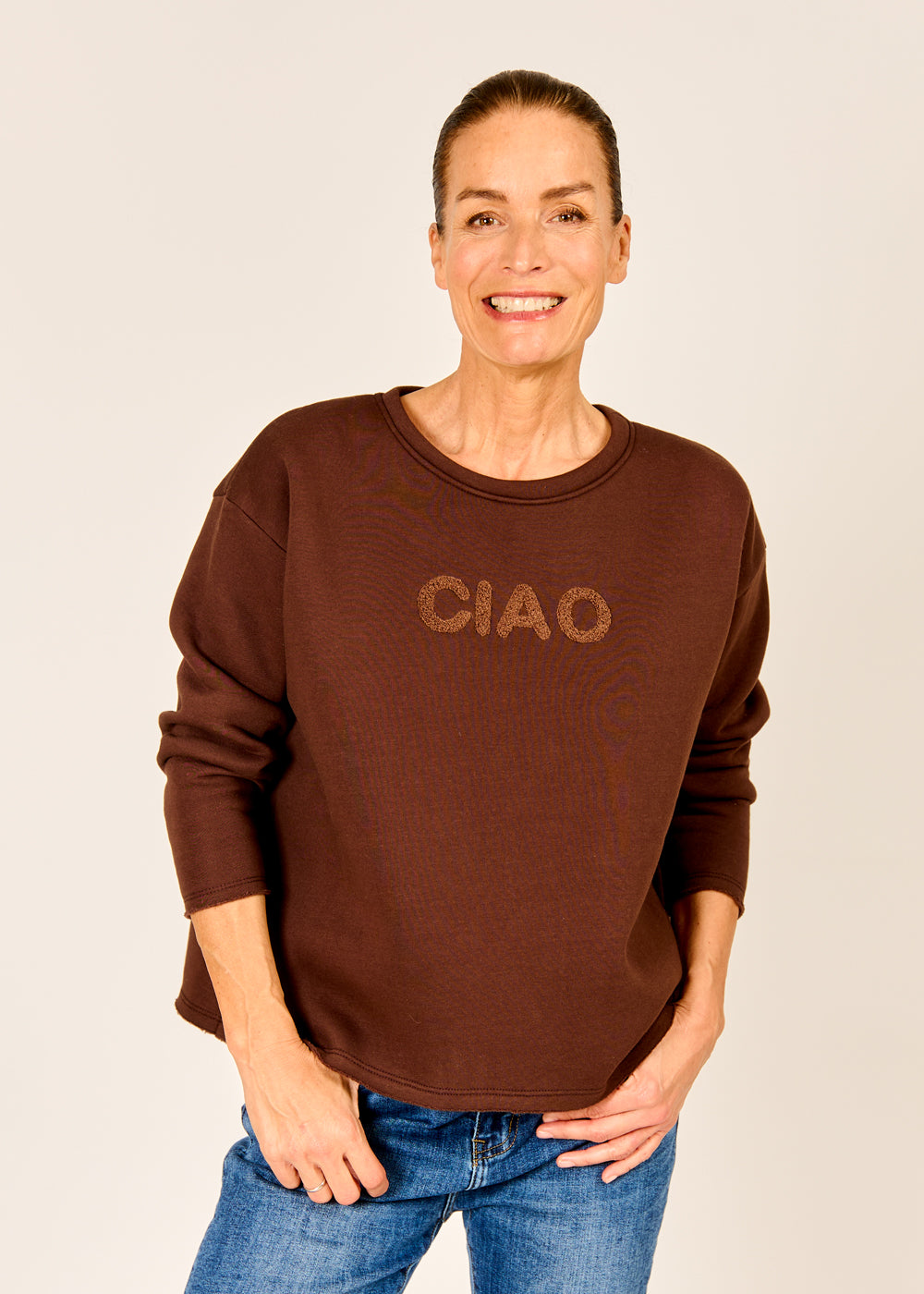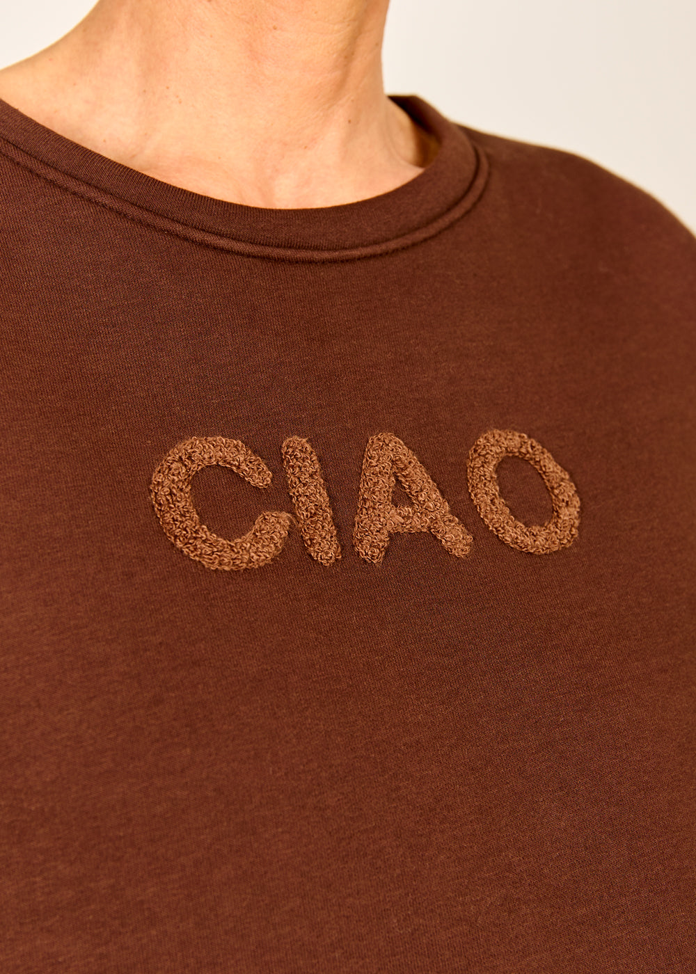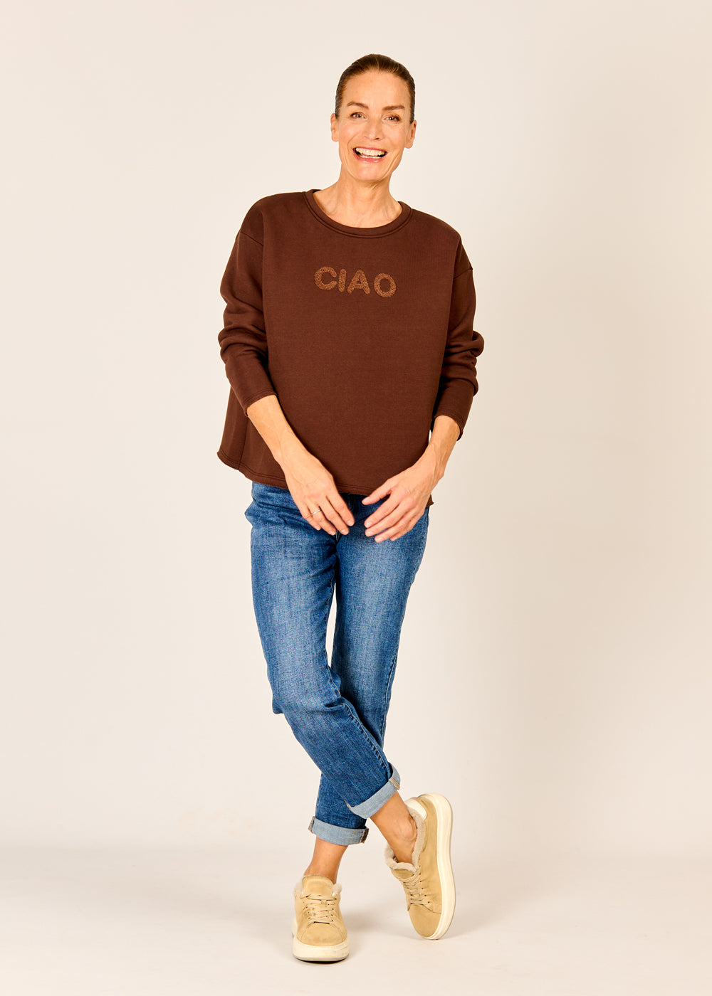 Dieses coole "Ciao" Sweatshirt in der satten Trendfarbe Mokka ist das lässige Statement-Piece, das Ihre Alltagsgarderobe sofort aufwertet. Der charmante 3D-Schriftzug "CIAO" in kuscheliger Teddy-Optik verleiht dem ansonsten schlichten Design einen spielerischen, italienischen Flair. Dank des lockeren, bequemen Schnitts und des weichen Materials wird dieser Pullover schnell zum absoluten Wohlfühl-Liebling. Kombinieren Sie ihn lässig zu Jeans und Sneakern für einen unkomplizierten, aber stilsicheren Casual-Look.