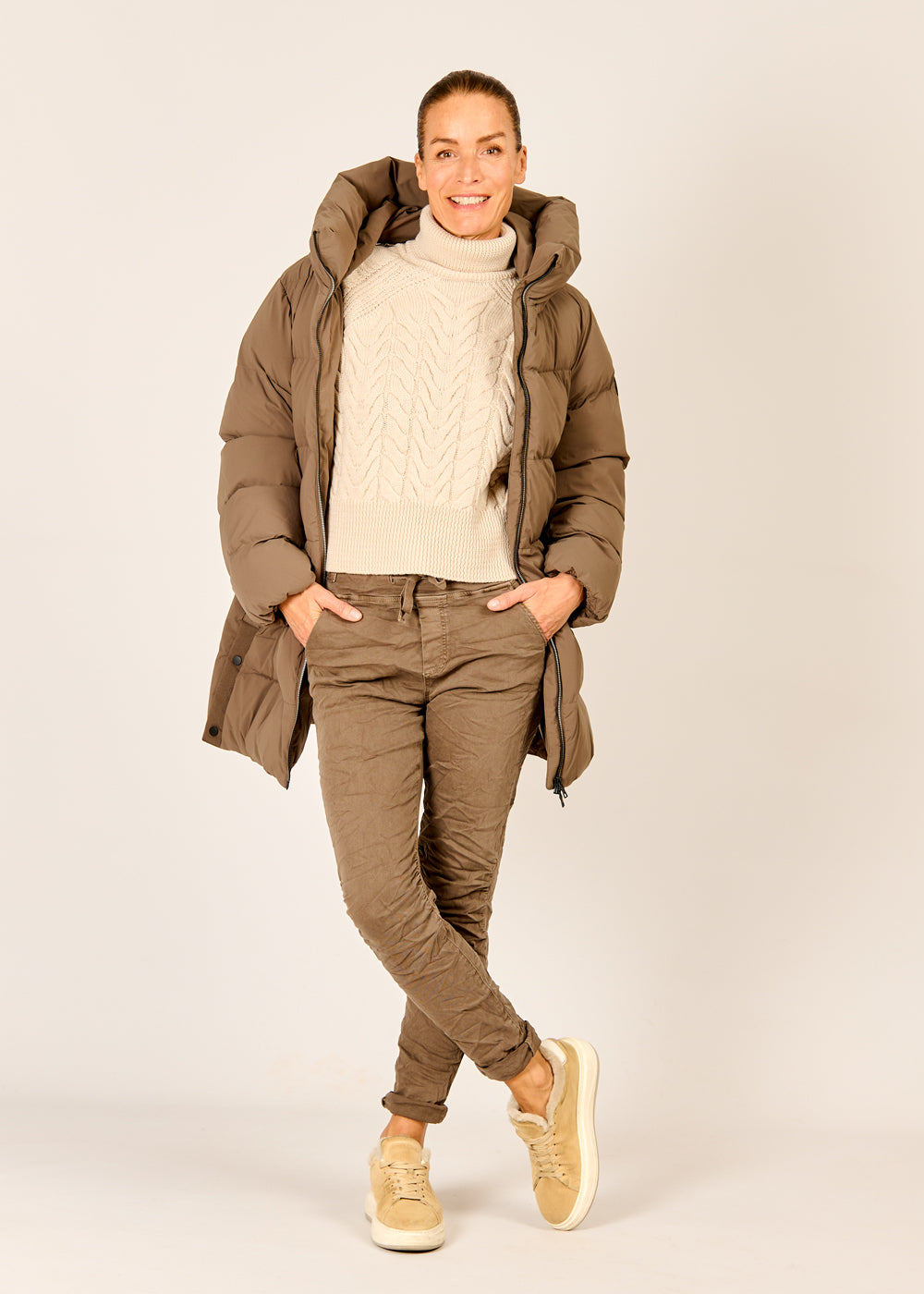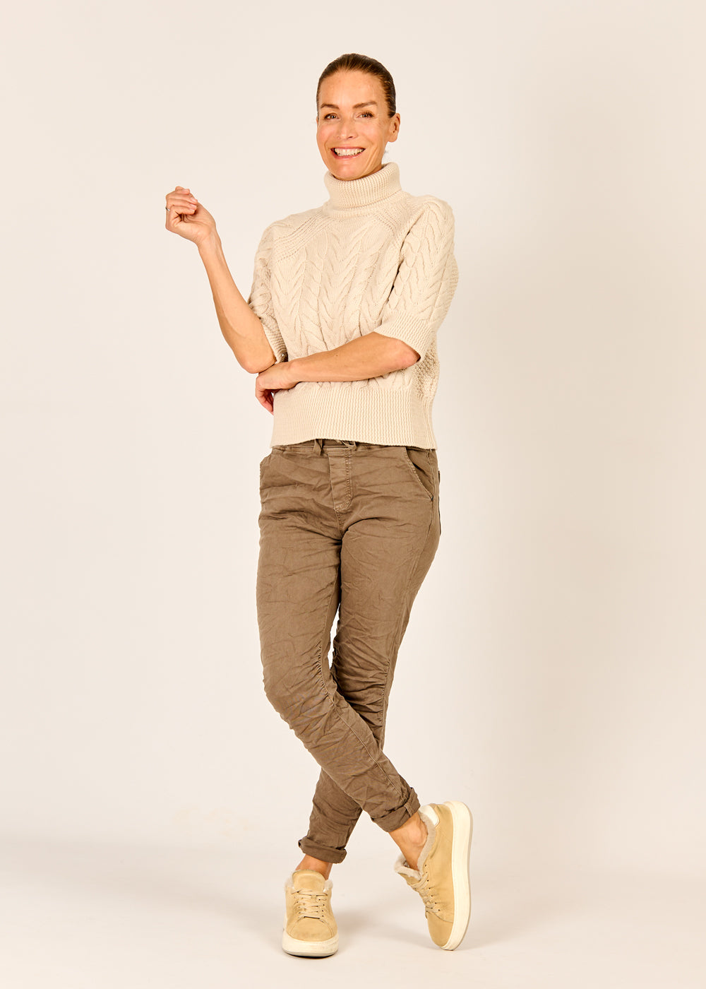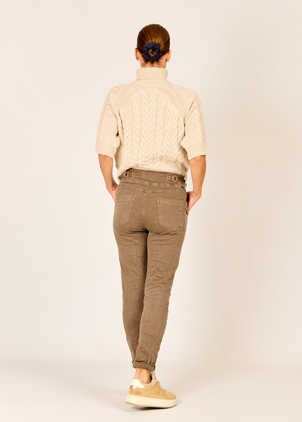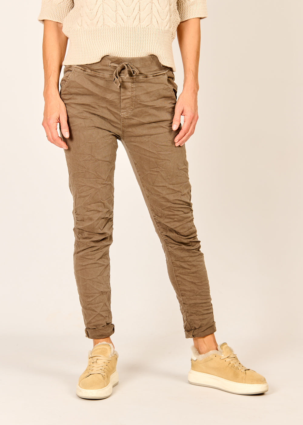 Diese modische Jogger-Hose in der vielseitigen Farbe Taupe ist die perfekte Symbiose aus Komfort und urbanem Chic. Der elastische Bund mit Tunnelzug und der lässige Schnitt sorgen für ein entspanntes Tragegefühl den ganzen Tag über. Die coole Crinkle-Optik und die schmal zulaufende Silhouette verleihen ihr eine trendige Note, die sich mühelos von Casual zu Smart-Casual stylen lässt. Kombinieren Sie sie mit Strick oder einer eleganten Bluse, um einen spannenden Stilbruch zu kreieren, der immer funktioniert.
