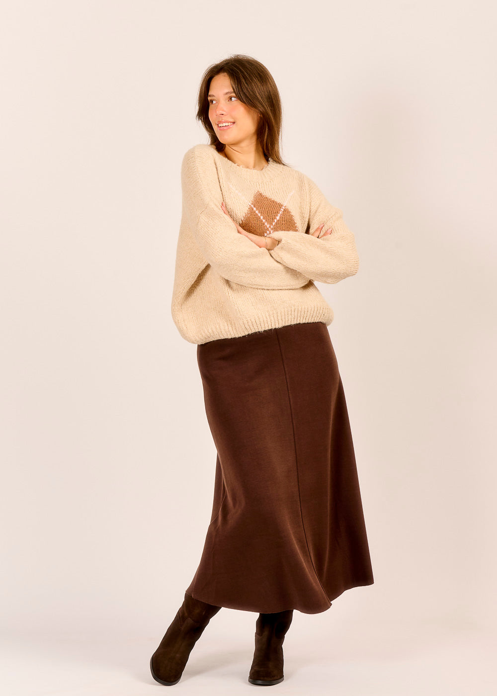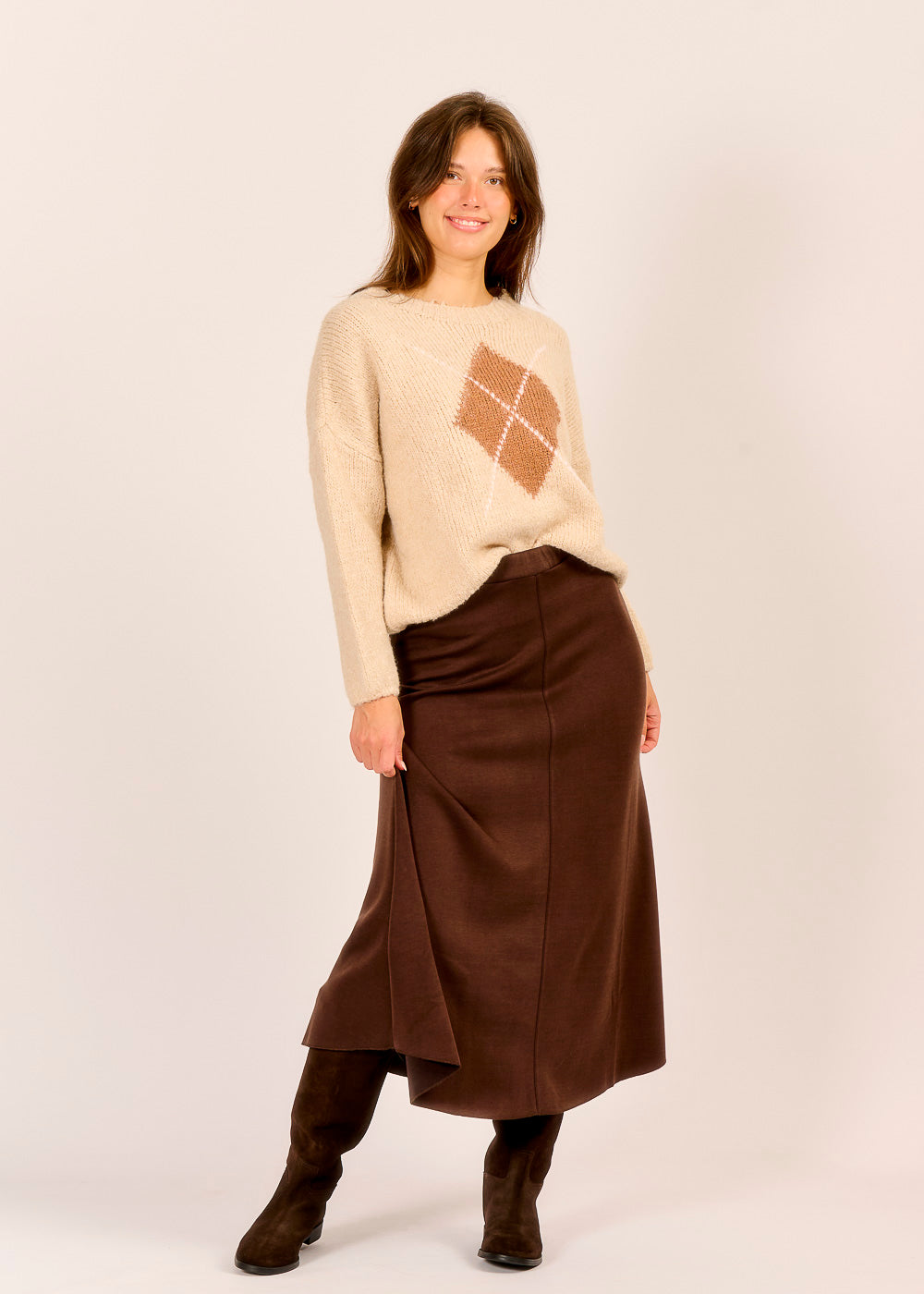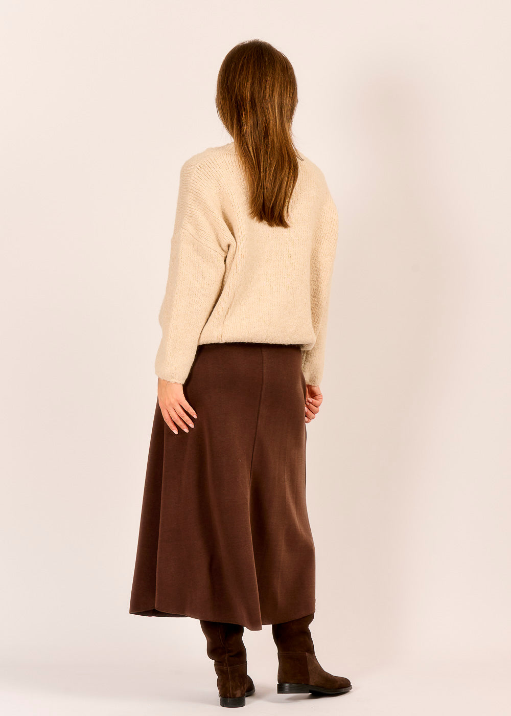 Dieser moccafarbene Rock bringt Wärme in jedes Outfit. Der Viskoseanteil lässt den Stoff fließend schwingen und schenkt dir bei jedem Schritt ein Gefühl von Freiheit. Er umspielt deine Silhouette und bewegt sich wie selbstverständlich mit dir.