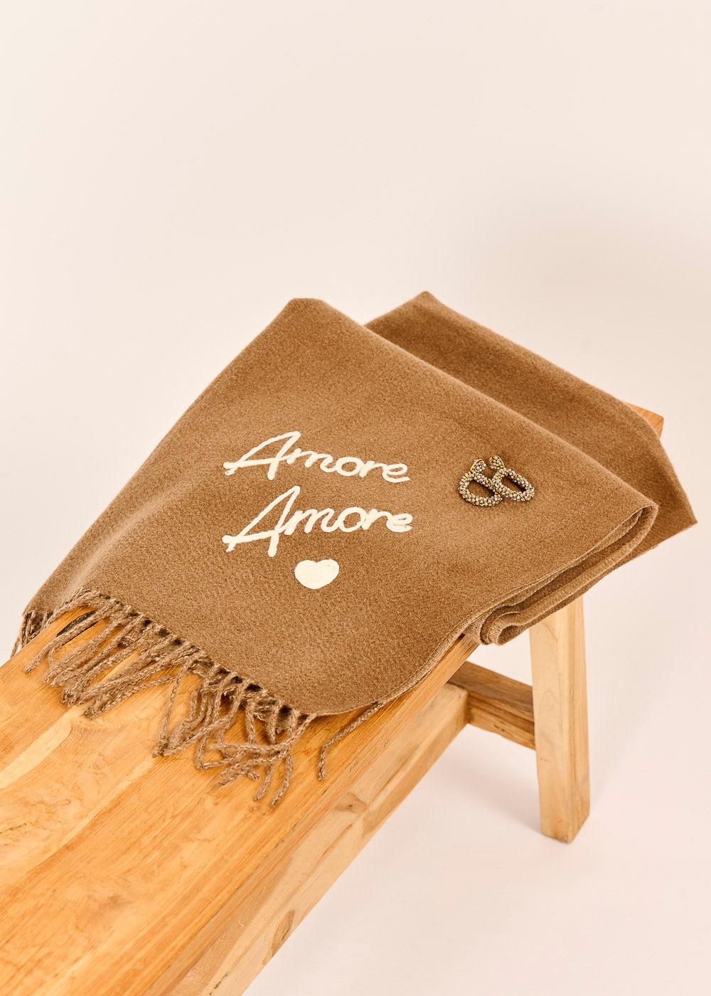 Umhüllen Sie sich mit Liebe und Luxus: Dieses edle Tuch "Sciarpa Frangia" in warmem Braun fängt mit der gestickten Botschaft "Amore Amore" die Essenz italienischer Romantik ein. Das weiche Material und die feinen Fransen garantieren einen fließenden Fall und halten Sie dabei stilvoll warm. Ob elegant über die Schultern gelegt oder lässig um den Hals gewickelt – dieses Tuch setzt ein emotionales und zugleich modisches Statement.